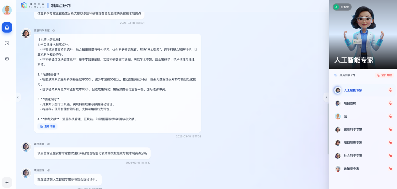 SciMatrix delivers an intelligent conversational interaction experience. After a user presents a goal or question, they enter a chatroom shared with various AI agents. Users can observe the project lead assigning tasks while discipline-specific experts freely share their perspectives on the researcher's questions within the group chat, faithfully replicating the dynamics of a real-world discussion.
