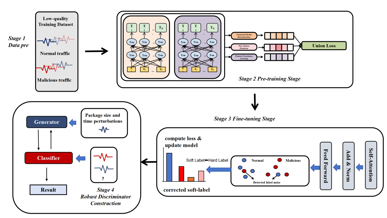 To address the above problems, the Cybersecurity Team of our center has proposed the METRA framework. This framework deeply integrates network protocol domain knowledge with deep learning techniques, extracts deep patterns from limited data through protocol-aware representation learning, tackles annotation errors via a probability-driven soft label denoising mechanism, and enhances model detection robustness based on dual-dimensional adversarial training. Experiments on multiple public benchmark datasets and real-world TLS traffic datasets show that METRA significantly outperforms existing methods in detection accuracy. It demonstrates outstanding robustness in adversarial attack scenarios, and its performance advantages are more pronounced in data-scarce and high-noise environments, fully verifying the practical value of this method in real complex environments.